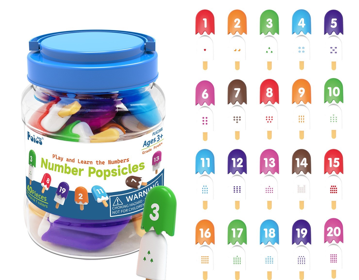 Designed for children aged 3–5 years, this colorful counting toy helps preschoolers learn numbers 1–20, counting, and color recognition in a fun, hands-on way. Each popsicle piece splits into two halves — one side shows a number, and the other side displays matching dots for counting practice.