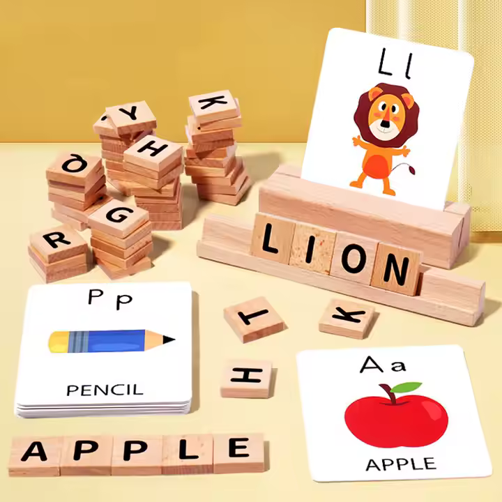 Key Features Durable and good quality Word spelling game English Letters Spelling Card Wooden Alphabet Spelling Toys Educational Toys Letter Spelling Toys The details are as described above What’s in the box 26pcs double side flashcards (two sided ) 52pcs wooden blocks 1pc wood base 1pc wood bracket 1pc storage bag